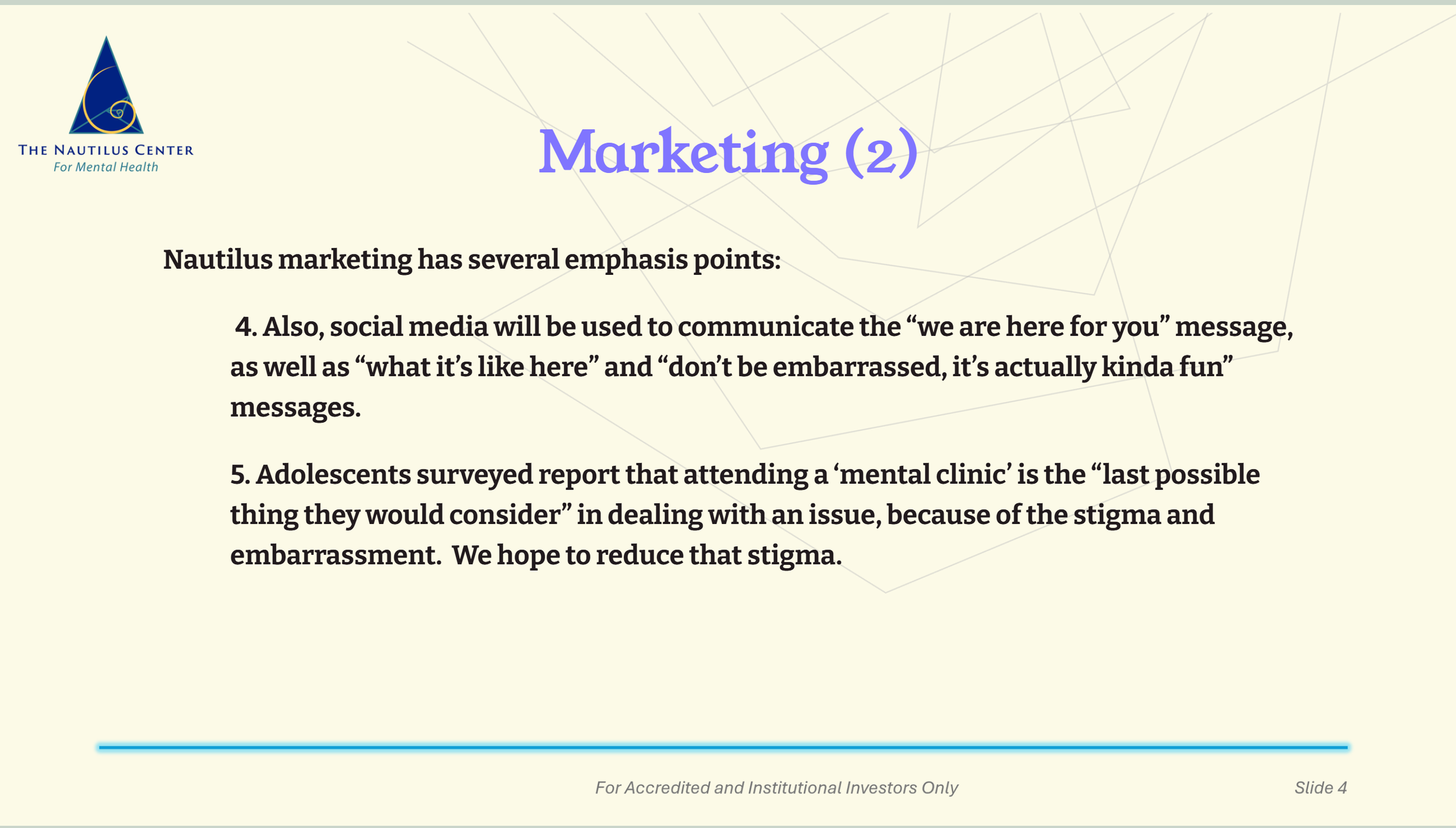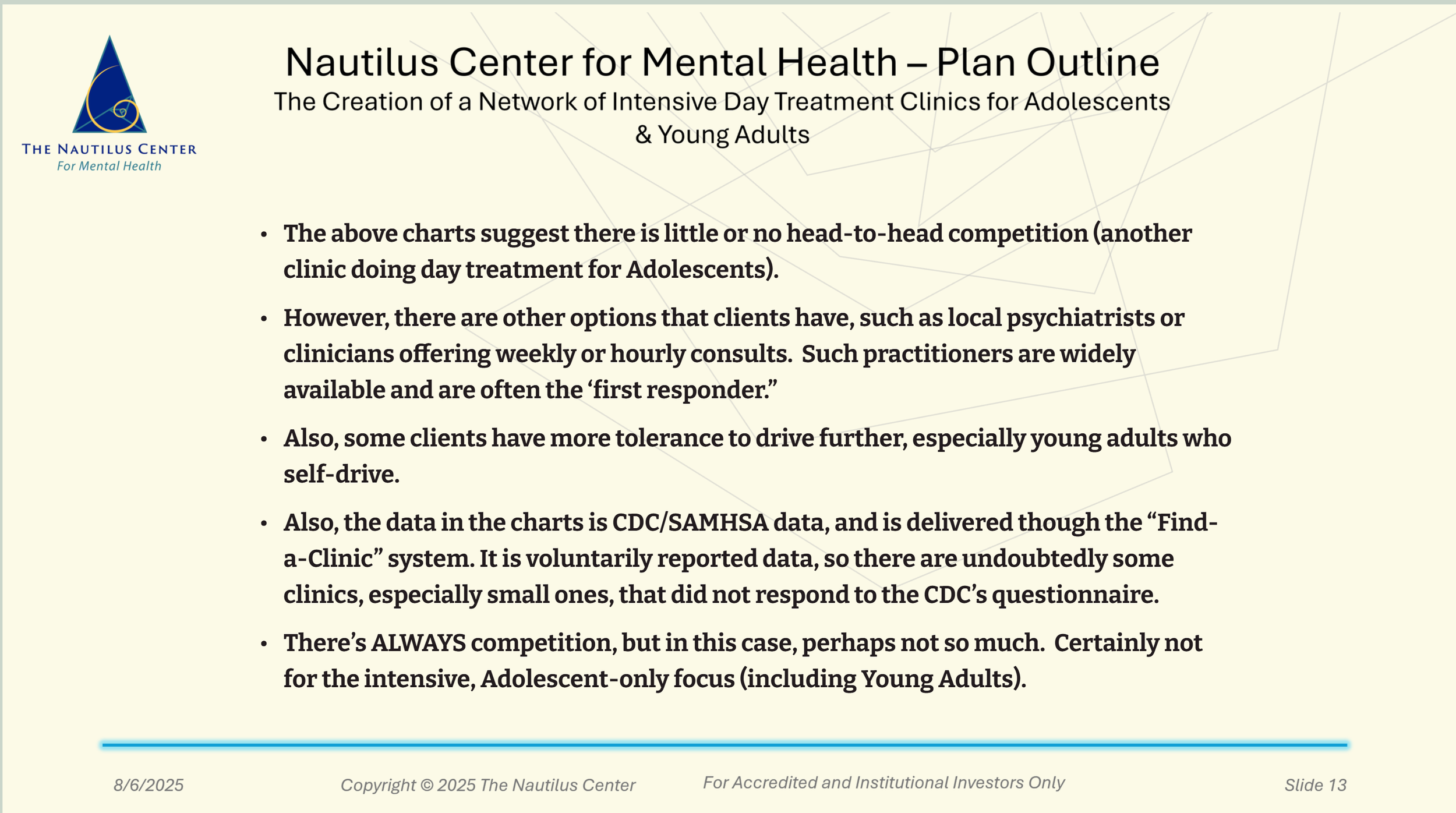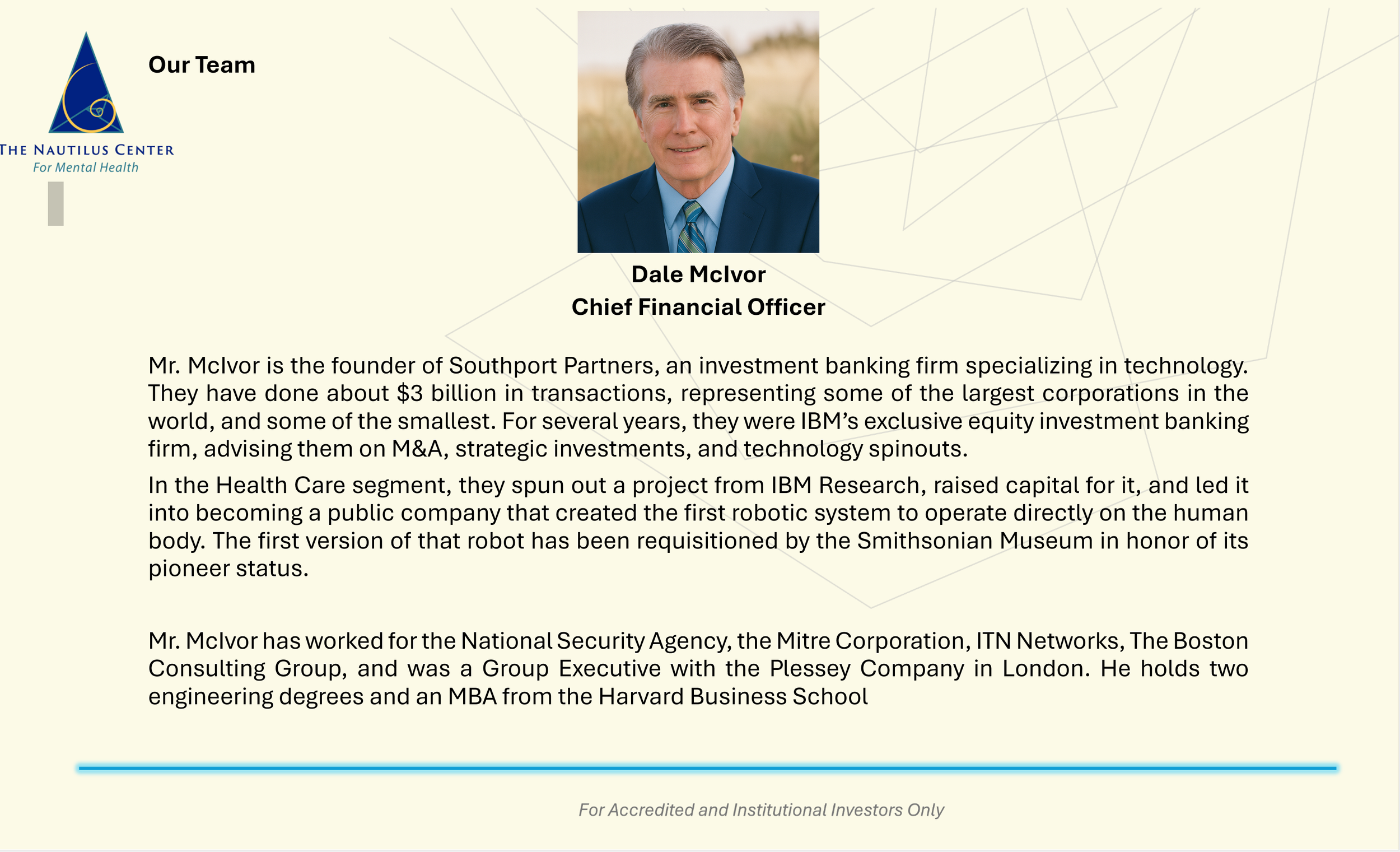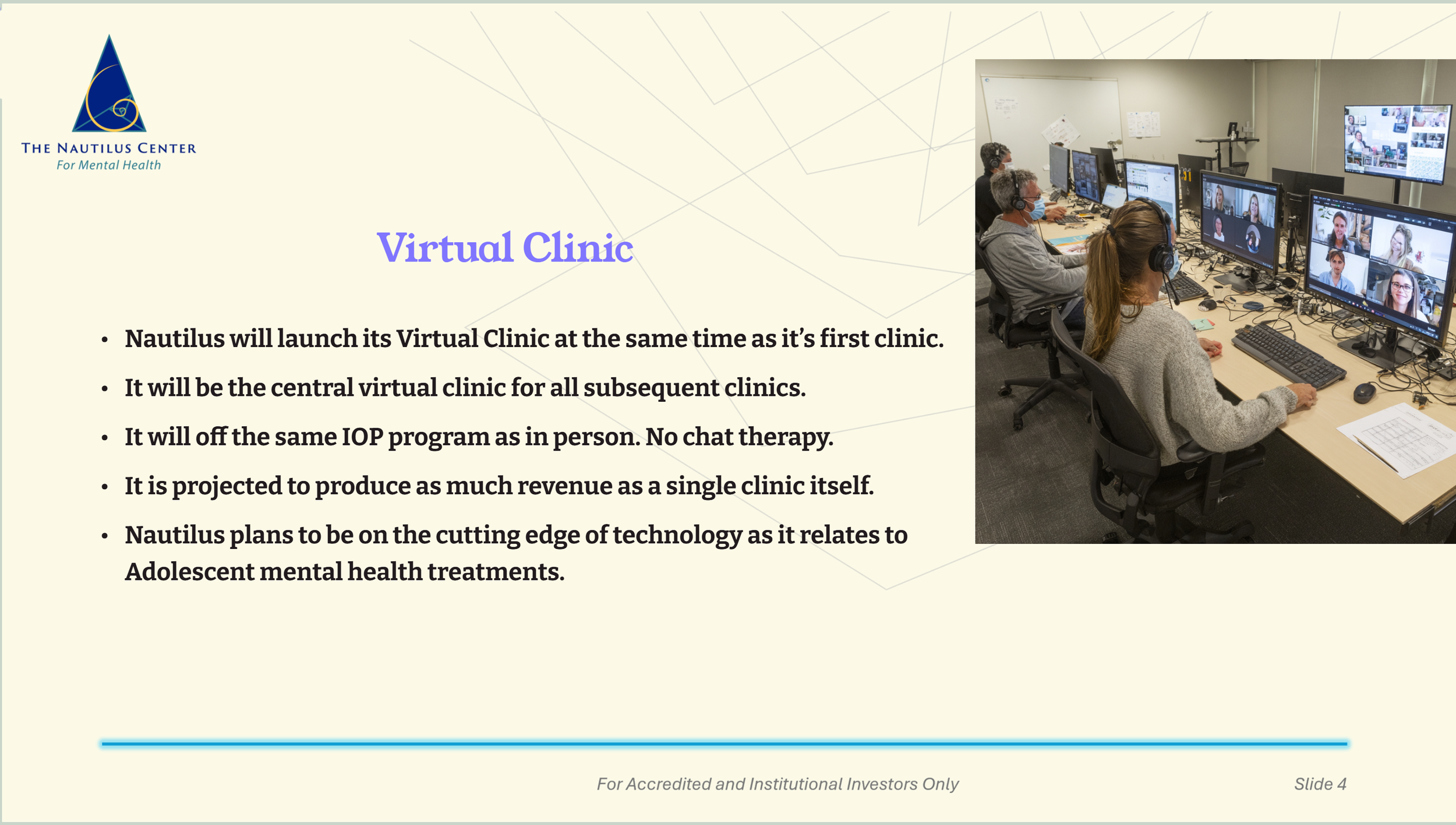 INTRO Intro The Problem Solution Market Competition Virtual Clinic Financials The Investment Offering Next Steps for Investment The Problem Nautilus Solution Executive Team Site Development Market & Marketing Competition Nautilus Virtual Clinic Financials Investment Offering Next Steps Towards Investing First, please indicate your interest level. Intro The Problem Solution Market Competition Virtual Clinic Financials The Investment Offering Next Steps for Investment